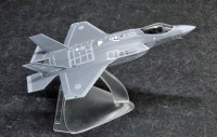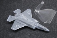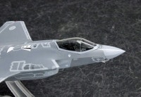 1/72 F-35A ライトニングII完成品、左後方からの全景。作品は飛行状態としており、付属のクリアスタンドを取り付けた状態で展示して頂けます。